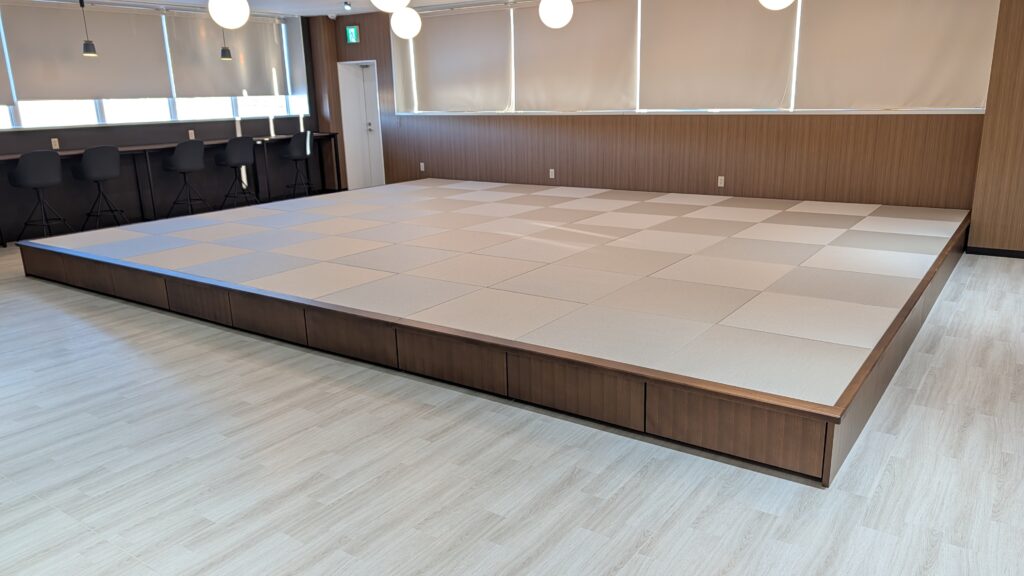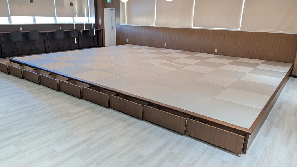 種類 畳ユニット 特注31.5畳 ダーク色 材質 框:ホワイトアッシュ無垢材 本体:タモ突板 抽斗:3段ソフトモーションペアリングスライドレール金属製 畳:和紙畳(灰桜色) サイズ W7300×D5725×H330